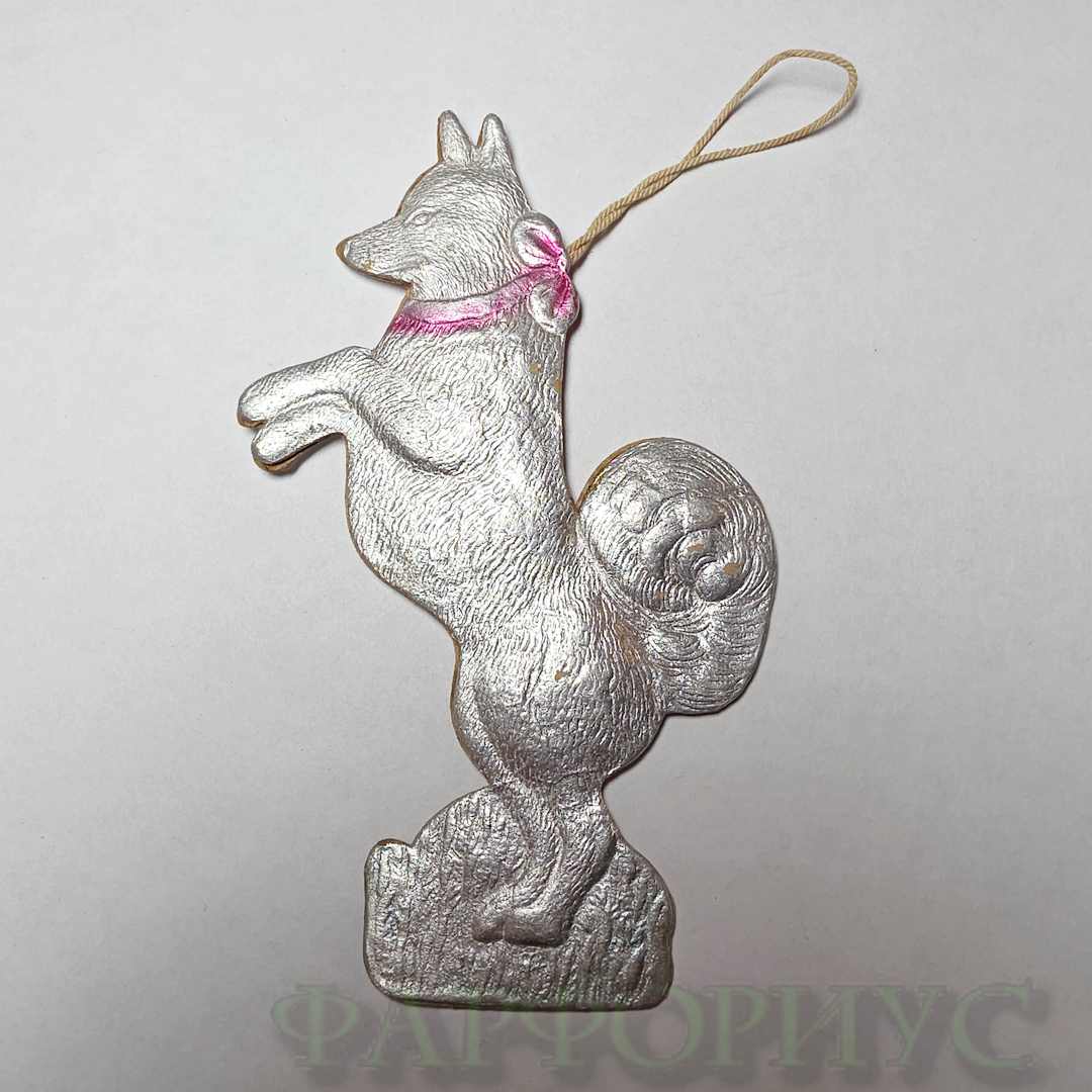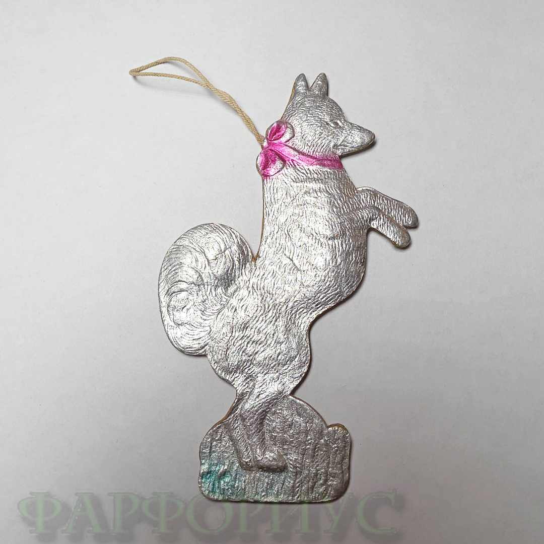 Антикварная елочная игрушка "Собачка" (Собака с бантом). СССР, 1950 гг. Картонаж. Высота 12 см.
