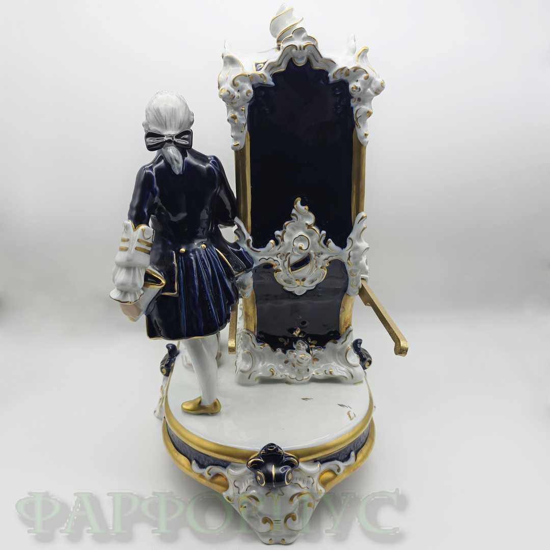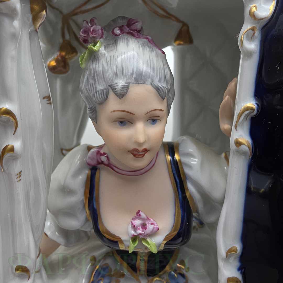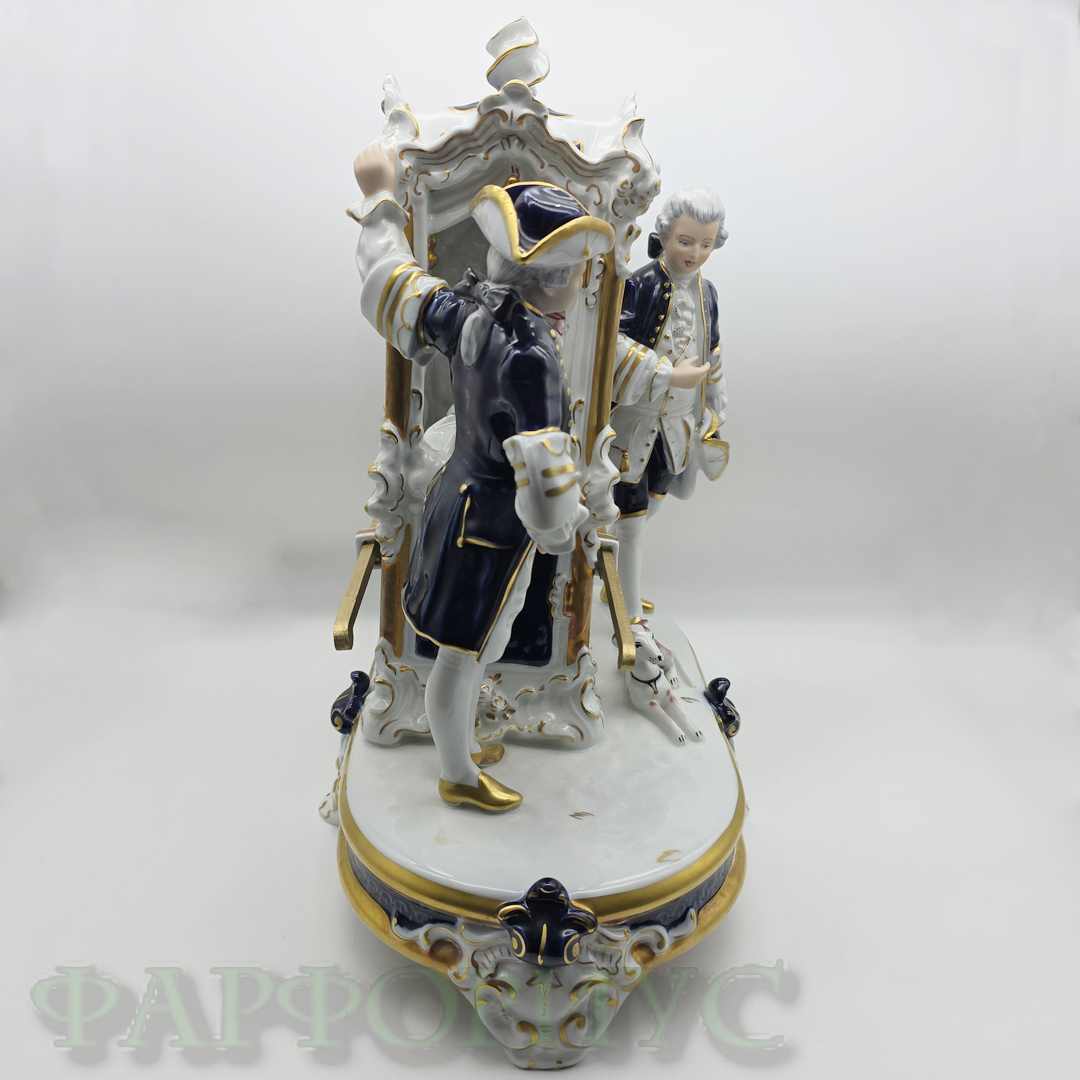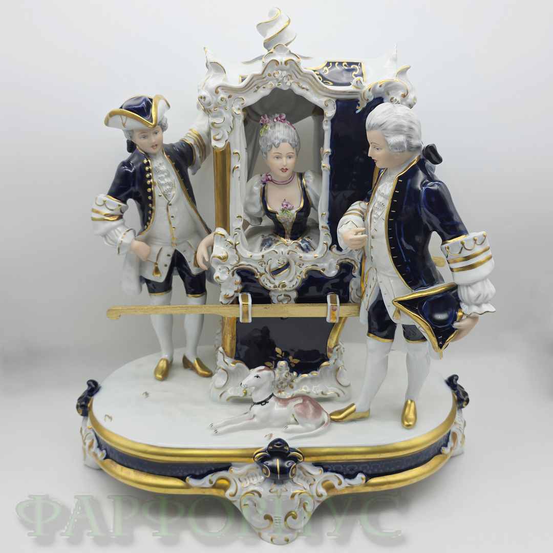 Большая фарфоровая композиция "Дама в поршезе с кавалерами". Чехия, Royal Dux, фарфор, ручная работа. Размер статуэтки 39 см на 35 см, без утрат.